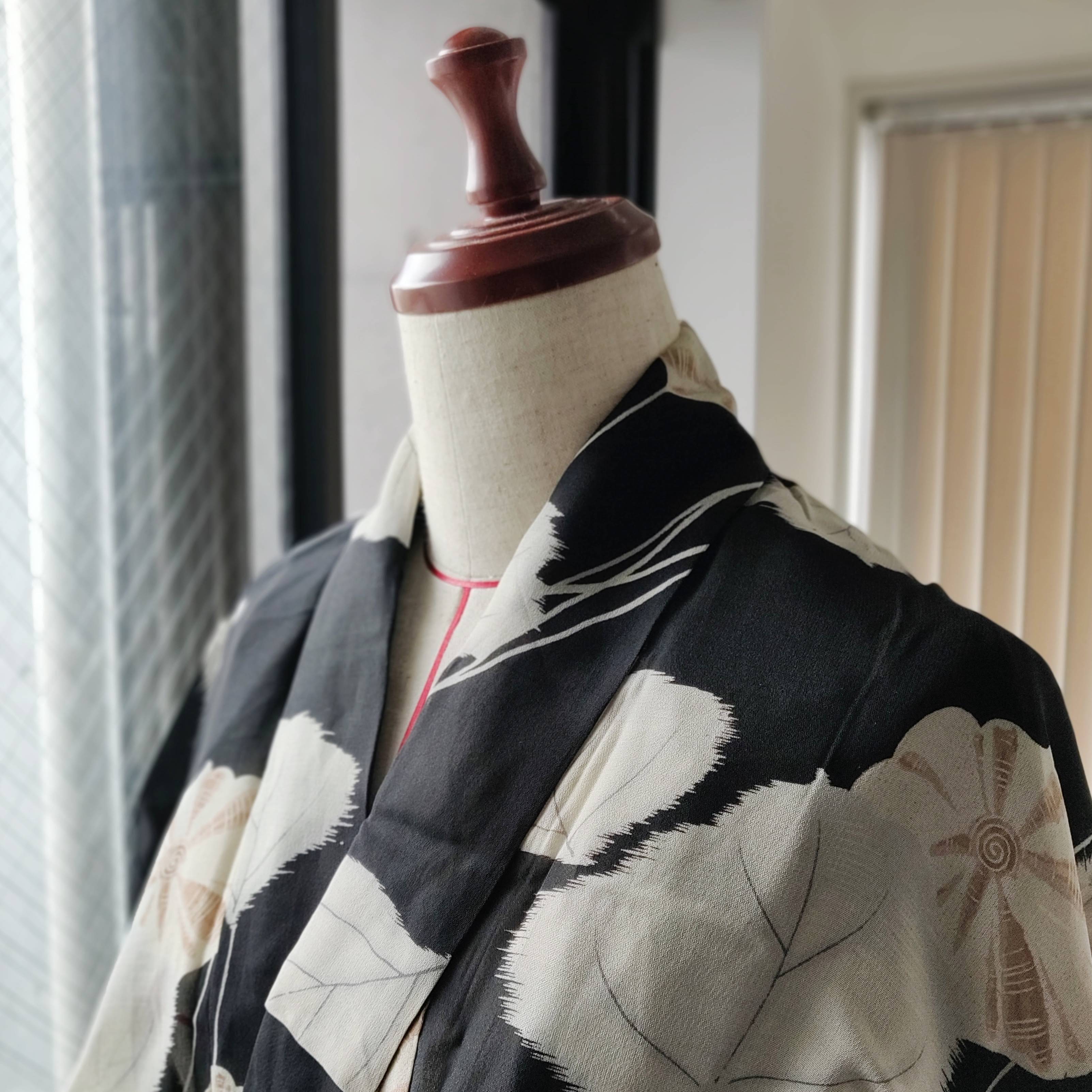 Last month, while visiting my favorite vintage kimono store, the shop assistant came up to me with star shaped eyes and a summer kimono. There were several holes, especially in the back, which sadly meant this hand-stiched gorgeousness had ended up in the “remake&recycle” section of the store. Since she knows I mostly wear black, both in and out of Wafuku (Japanese-style clothing), and that I sew, she immediately thought I would be interested in this piece.