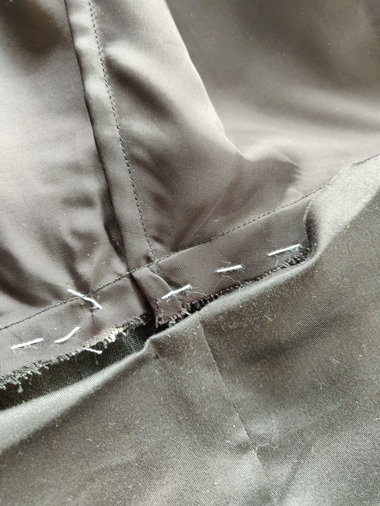 The underlining ends about 5 cm higher that the self fabric. Besides French seams, I also finished the center back seam, where the zipper is placed, with satin bias tape, and interfaced the straps with self fabric. Ideally, I should have used sheer interfacing, but I only had it in white, and was too determine to finish the dress.