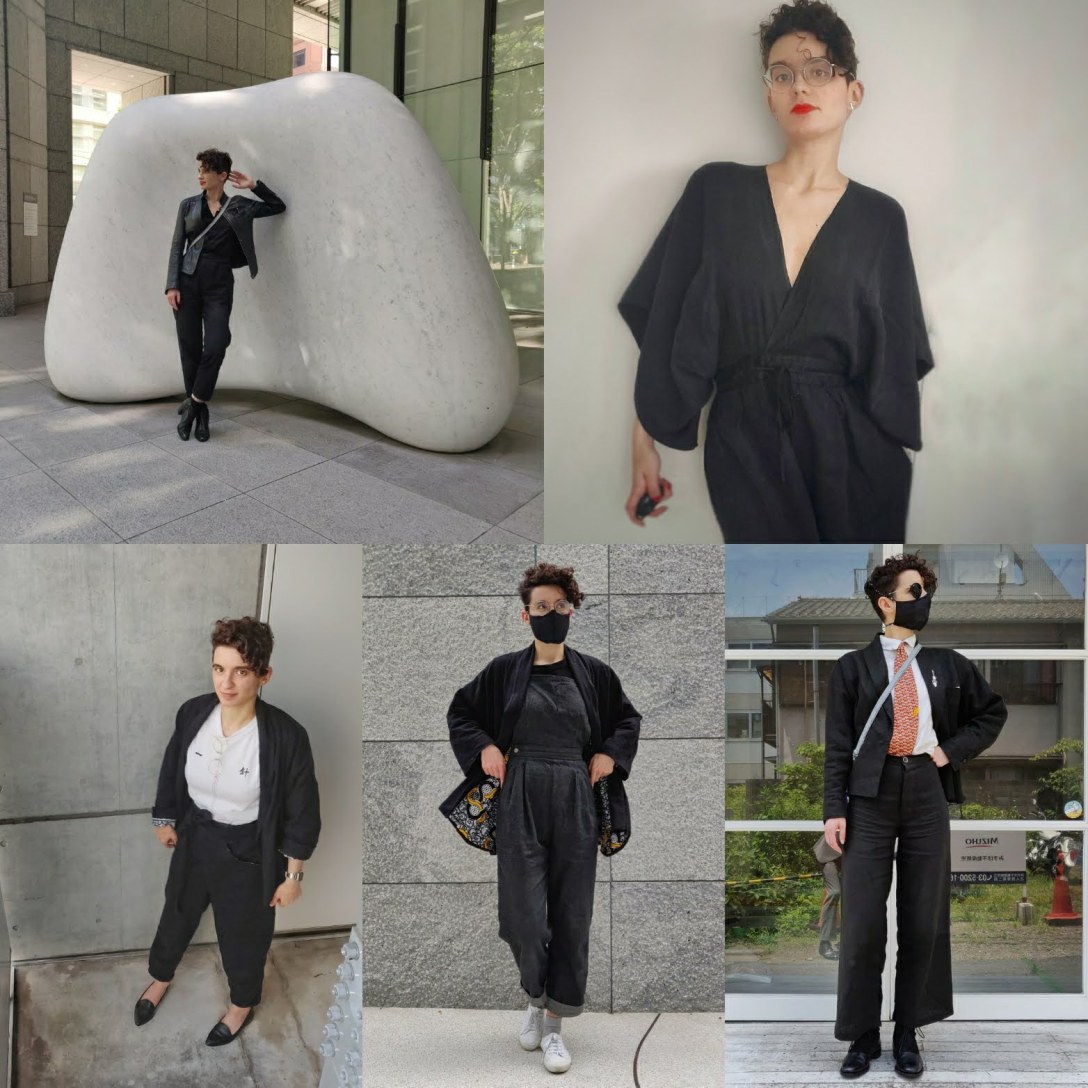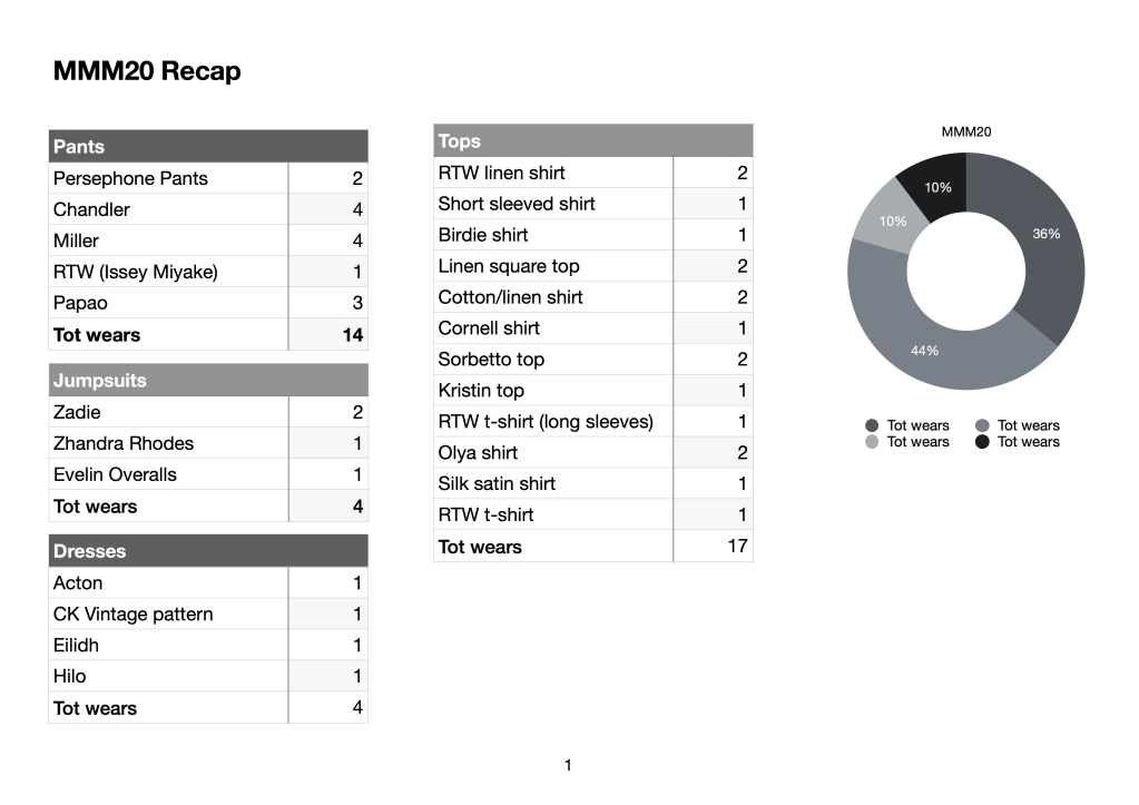 Not surprisingly, I basically wore the same pants all month long. These pants are all very comfortable, though after a month of elasticated waists I do miss a zipper! And wearing boots. In addition, the most worn tops (and what I find the most frustrating not to find in the closet when I need to do laundry) are my shirts. I’m desperate for more, but a lack of shirting fabric in my stash and my current own personal toiles and tribulations have put that on hold. I’m so looking forward to a time where I have perfected my own patter and can make 10 shirts in series. One day, folx, one day!