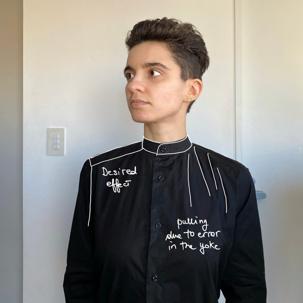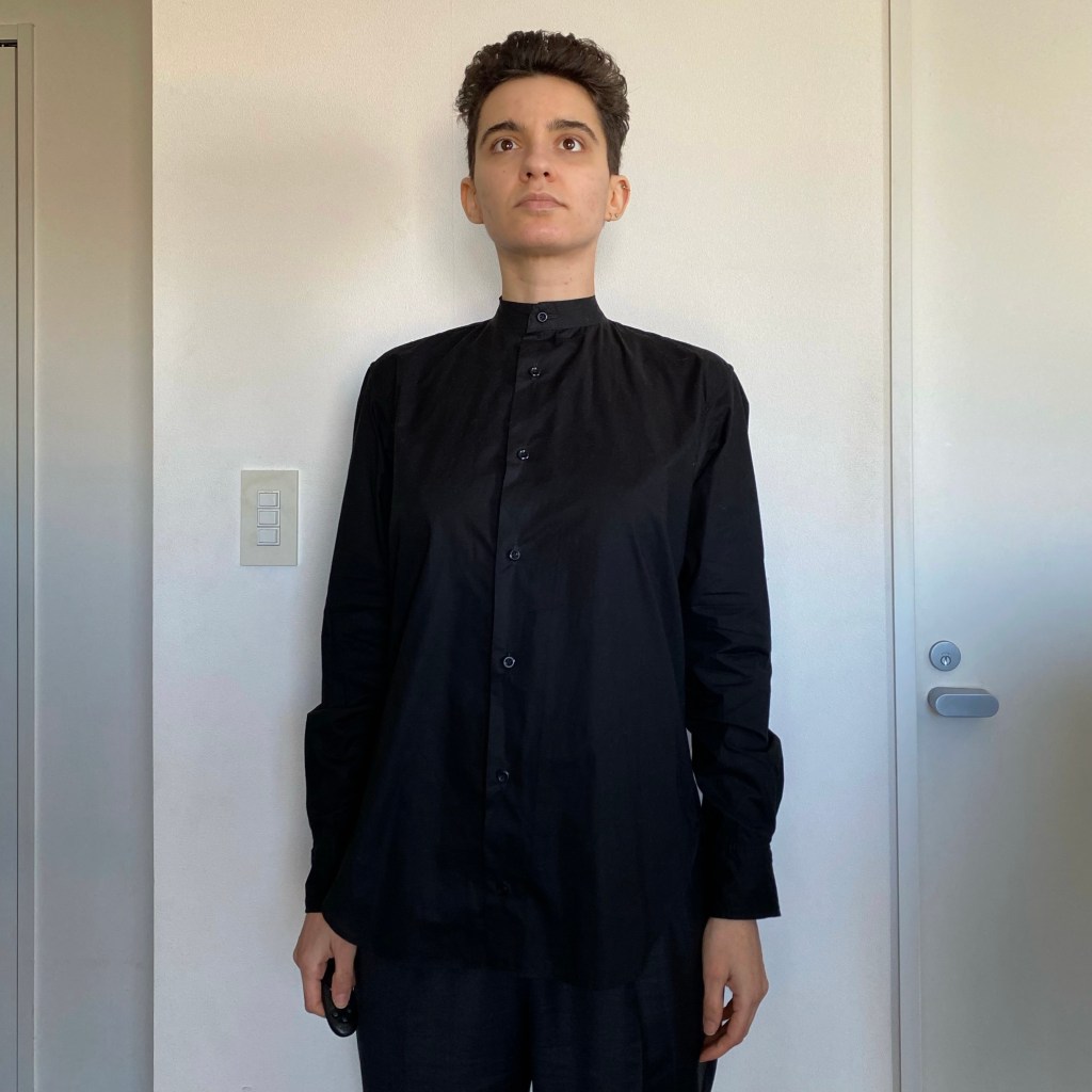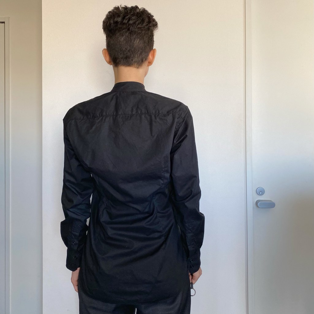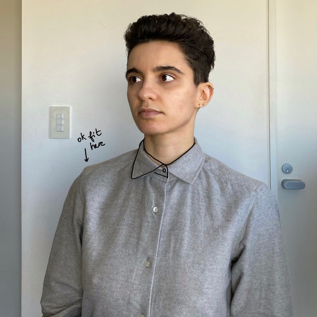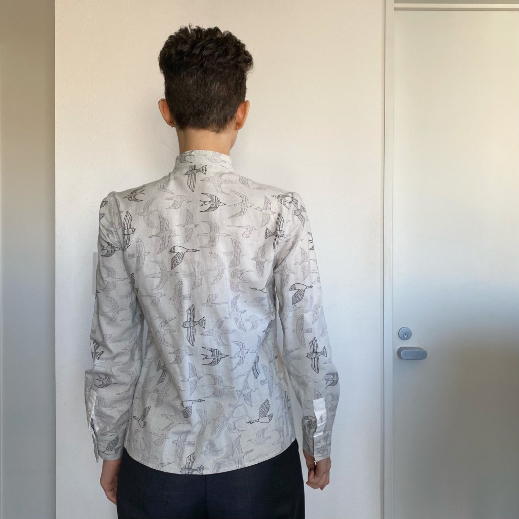 To begin with, the bust dart gives me dysphoria. I realize bust darts are a way to conceal a bust, but I’d rather experiment more with fit than be reminded of societal expectations when it comes to my body (if you want to know why the link between busts darts-womenswear-womanhood-female bodies is problematic, look here). In addition, the collar is still pretty wide, though in this case I don’t mind too much since this style is never going to be worn with a tie anyhow.