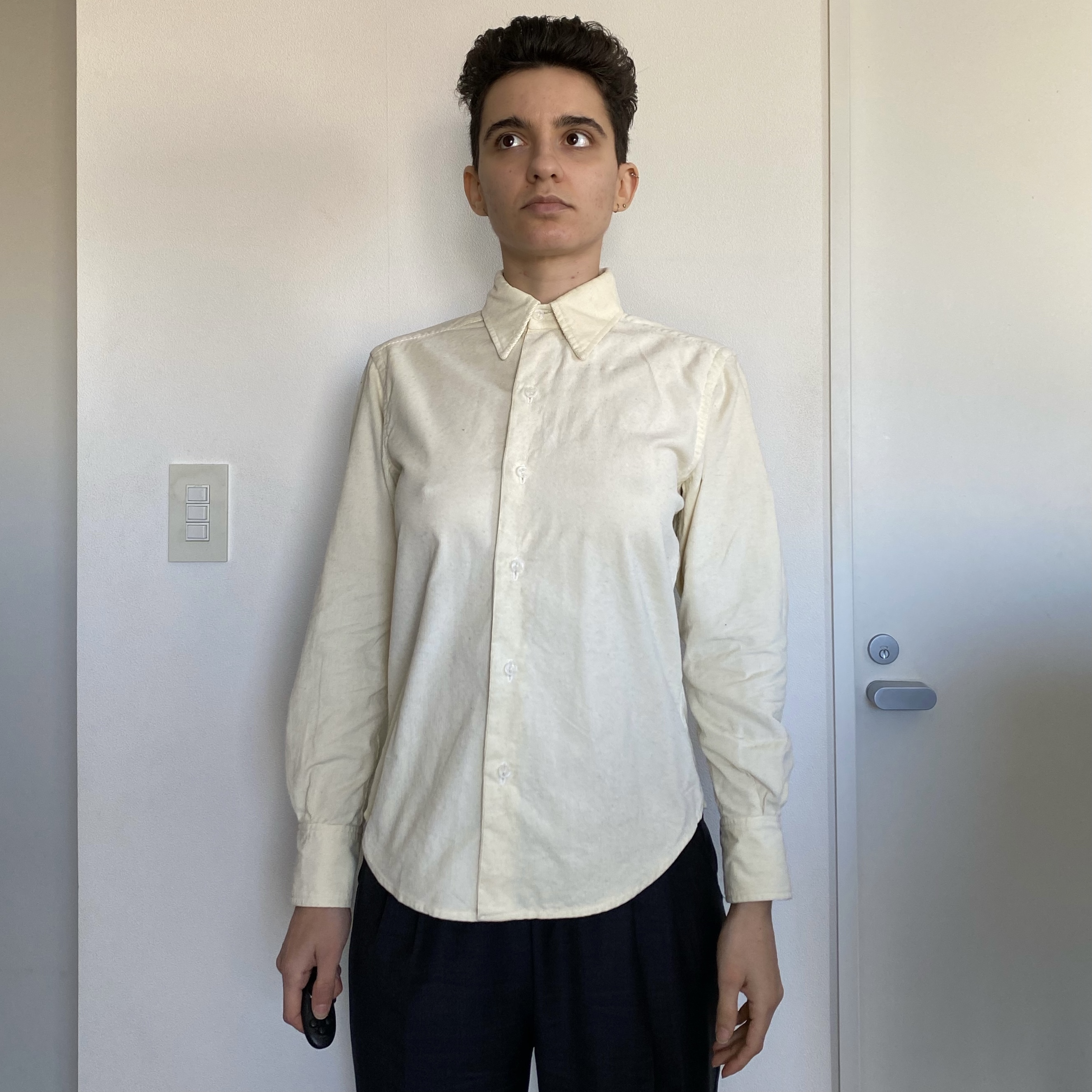 In the same trip to Check&Stripe I also purchased some ivory needlecord, a lovely and soft fabric I’m in disbelief I only started using this year. I enthusiastically cut the needlecord and made another version using the same pattern as the grey one but adding another 0.5 cm to the fronts. I also opted for a standard collar because I think it proportionizes my square jaw. This is quite a large collar: the tips are 8 cm long, and the stand is 4 cm high at the center back. However, it looks proportionate on me because of my long neck.