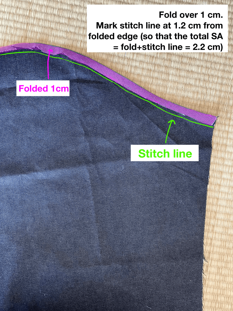 First of all, in our pattern pieces we need to add to the seaming allowance (SA from now on) of the sleeves. In my case, the SA at the sleeve is 1.2 cm, and I added 1 cm to the SA of the sleeve piece only. So now, what I did was to fold over this extra 1 cm on the sleeve, and also marked the actual stitching line, 1 cm from the edge of the body piece. For now, forget there is a fold there, treat it like an edge.