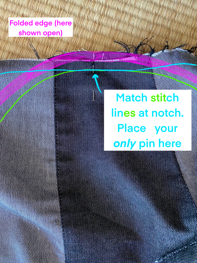 Place the sleeve under the body, right sides together. I previously marked a notch on the apex of the sleeve, and a corresponding one the body – in my case located in the middle of the shirt yoke. These notches correspond to the mid point of the sleeve/armhole seam lines. Insert your one precious pin here: this will be your center of rotation.
