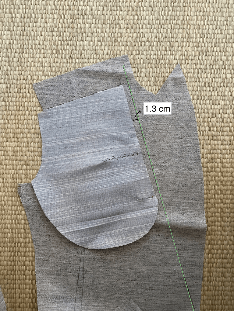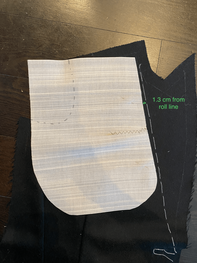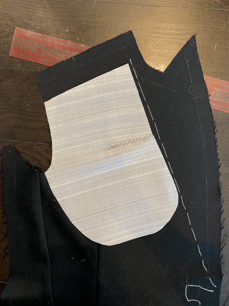 (Addendum: technically there’s a difference between a three-piece jacket and a two-piece jacket when it comes to cutting the fabric, which I’m not covering here for simplicity. I’m using a two piece jacket here. If your pattern has a side piece, then use the front piece as a model and extend the canvas at the armscye by 5 cm, to the center of the armhole)