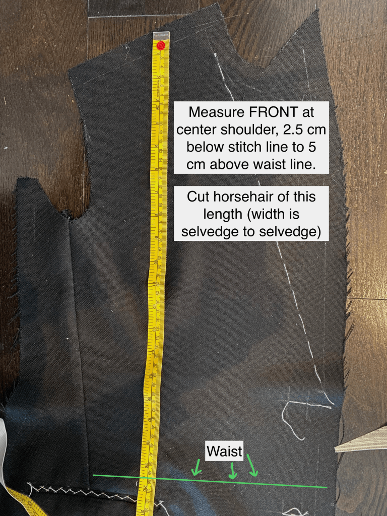 The first part you are going to canvas it the floating chest piece (also called plastron) to the body canvas. Horsehair has actual horse hair and is therefore quite prickly, and for that reason domette/flannel is used to cover the horsehair side toward the body.