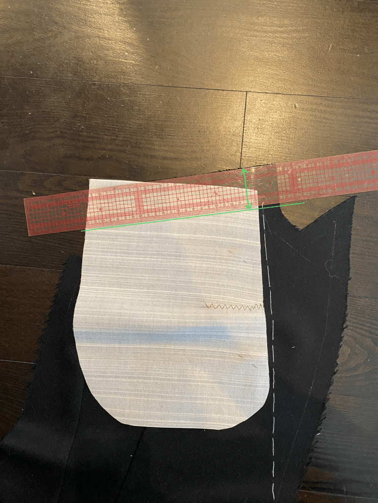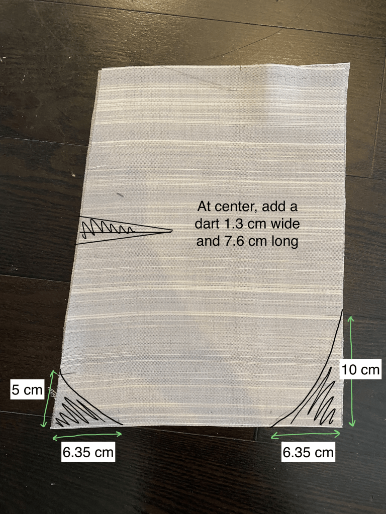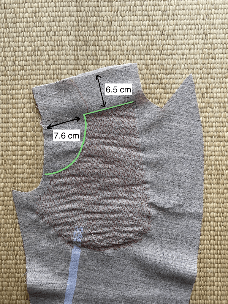 Baste all of the pieces together as indicated in the diagram above and trace a line 6.5 cm below the shoulder and 7.6 cm from the armscye as shown below.