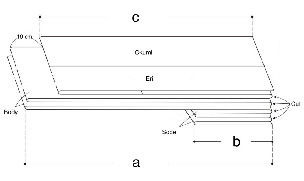 This is because a is the mitake + 2 cm of SA, b is the sode take + 4 cm of SA, and c is the okumi (same old a – 19 cm), but given the different arrangement of the pieces you end up with a different distribution and yardage. The more you know! Below is a simple graph on how to cut the western fashion fabric. I haven’t explained the slit for collar (eri kata aki) yet as this is part of the marking process so ignore it for the time being.
