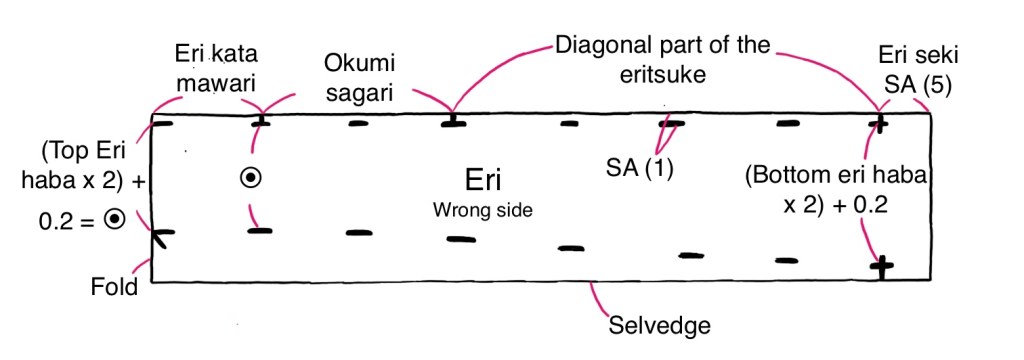 In our example we are doing what’s called a ばち衿/pachi eri, which is more casual and completely closed, as opposed to the 広衿/hiro eri, which you fold down to your preferred width yourself. The bachi eri is less wide at the CB than at the bottom (the eri seki) so mark accordingly as illustrated below.